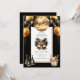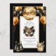 A modern Mardi Gras masquerade party, featuring gold and black balloons, and gold glitter, a disco ball, and party hats, with a bucket of champagne. An elegant painted mask takes center stage in this design. Elegant and festive. Available in print, as a digital download, or both!