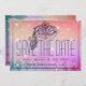 Invitation les clients de votre Mardi Gras avec élégance grâce à cette carte à plat d'invitation. Ce modèle de conception a un violet de pêche arrière - plan et vert accentué par l'arlequin et le bling. Le texte dit "Sauvegardez la Date" avec la date, la ville et l'état pour vous permettre de personnaliser. Le verso de l'invitation a une zone pour plus de détails de fête à customiser. Conçu par un artiste mondialement connu ©Tim Coffey.