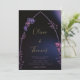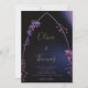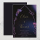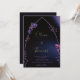 Les roses et les feuilles d'eucalyptus, dessinées à la main au crayon de couleur et superposées numériquement avec du violet, créent une invitation de mariage moderne, sophistiquée, élégante et chic avec un cadre d'arche gothique simple et minimaliste. Le fond noir et bleu foncé avec des nuances de violet et de lumière illumine le ciel de minuit. La calligraphie élégante, de la teinte de l'or, rend cette invitation noire et violette encore plus élégante.