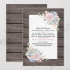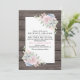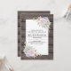 Faire-part de mariage champêtre chic avec un fond de grange en bois rustique, un coin de succulents rose pêche et un modèle de texte de mariage.