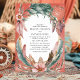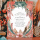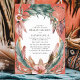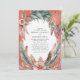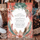 Cette invitation de mariage bohème présente une délicate couronne de plumes, de feuilles et de fleurs entourant une zone de texte centrale, avec un attrape-rêves ajoutant une touche fantaisiste. Placée sur un fond corail doux, les tons terreux et les éléments naturels créent une atmosphère sereine et libre, parfaite pour un mariage inspiré du style bohème. Ce design capture l'essence d'une célébration décontractée et amoureuse de la nature, idéale pour les couples recherchant un style de mariage unique et détendu.