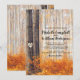 Cartes d'invitation de mariage champêtre en automne avec un bois rustique, des feuilles rouges, orange et dorées, des bouleaux argentés, un cœur sculpté de conte de fées sur l'arbre avec les initiales des mariés, et un modèle de mariage élégant et modifiable.