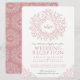 Invitation de réception de mariage avec art botanique de feuille en croissance dessinée à la main rose poudré, après le mariage. Conception de feuille simple encerclant votre propre monogramme. Dans de jolies nuances de rose tendre et de gris sur fond blanc. Autres couleurs et articles assortis disponibles. © Dessin original de feuille et conception par Sarah Trett pour www.mylittleedenweddings.com sur zazzle.