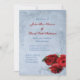 Elégant design vintage en cascade bleu faire-part de mariage avec des rouleaux d'angle décoratifs en haut et en bas avec une photo de trois roses rouges dans le coin inférieur. On donne à l'arrière - plan une application de grunge texturée pour un look de papier ancien. Ce design est offert en plusieurs arrière - plans prêts à l'emploi. Ce design est également offert sur de nombreux autres produits de papeterie pour répondre à tous vos besoins en mariage.