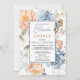 Cette conception présente une aquarelle illustrant des pêches pâles et des fleurs bleues rousses avec des confettis dorés sur le dessus.
