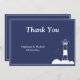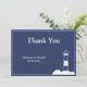 Elégante et simple carte de remerciement bleu marine avec une illustration d'un phare pour un mariage marin et nautique ! Une façon sobre de remercier vos proches qui vous honorent de leur présence à votre mariage ou de leur gratitude pour les cadeaux offerts.
