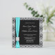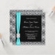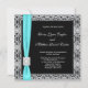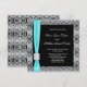 Carton d'invitation de mariage noir avec superposition de dentelle grise argentée et nœud à ruban à garniture de diamant bleu turquoise.