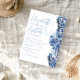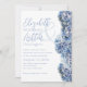 Les fleurs bleues d'hydrangée bordent les invitations de mariage. Des fleurs de bleu clair et de lavande créent une belle bordure sur le côté droit du papier blanc. Nom complet du couple, et tout le texte faire-part de mariage s'aligne à gauche. Le texte est gris bleu dans le texte manuscrit et imprimé. Les prénoms sont en gros caractères avec des noms imprimés en dessous. Le libellé invite la mariée et le marié. Un exemple de libellé est : "(Avec leurs parents) demandez l'honneur de votre présence à notre célébration du mariage." La date de l'événement est plus grande pour se démarquer et peut être écrit ou numérique. Choisissez un papier spécialisé, des coins arrondis et / ou une option de téléchargement instantané.