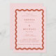 Une invitation de mariage moderne et élégante avec une ambiance rétro caractérisée par un cadre vague en terracotta sur fond rose blush, avec texte en terracotta.