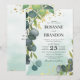 Cartes d'invitation de mariage romantiques et rêveuses avec un fond rustique délavé à l'aquarelle, des feuilles botaniques vertes élégantes, des éclaboussures de foil doré faux, et un modèle de mariage simple qui est facile à personnaliser.