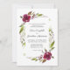 Ce faire-part de mariage présente un élégant graphique en aquarelle de fleurs de couleur bordeaux accentuées de feuillage vert sur un arrière - plan blanc. L'arrière est bordeaux.