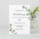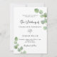 Un arrière - plan blanc décoré de sprigs de verdure d'eucalyptus. Personnalisez et votre nom et les détails de la cérémonie. Lettres de couleur noire. Retour : arrière - plan vert