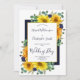 Ce magnifique design moderne et rustique présente des bouquets de tournesols luxuriants, des roses bleu marine et de la verdure, dont des feuilles d'eucalyptus et des fougères. Derrière les bouquets se trouve un rectangle bleu marine foncé, devant une zone blanche dorée avec le texte personnalisable en bleu marine dans un script tendance, élégant et sans serif typographie. L'arrière est la marine correspondante. Vous pouvez personnaliser cet article pour votre événement spécial en modifiant le texte du modèle de produits.
