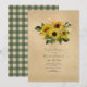 Invitation de mariage champêtre en automne - arrière-saison dans une grange rustique avec des tournesols et une nappe à carreaux verts au verso.