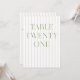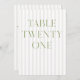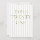 Ce numéro de table élégant présente un fond rayé beige doux avec une typographie sérif vert sauge raffinée et des accents de script subtils. Conçu pour les mariages en plein air, les réceptions raffinées et les célébrations en plein air intemporelles.