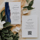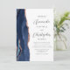 Le bord gauche de cette élégante invitation de mariage moderne présente une bordure d'agate aquarelle bleu marine ornée de paillettes de faux or rose. Le texte personnalisable combine des polices de caractères grises charbon et sans empattement sur fond blanc. Le verso offre un espace pour les détails du mariage, ainsi qu'un code QR que les invités peuvent scanner pour visiter votre site web et répondre, ce qui permet d'économiser le coût d'impression et d'envoi de cartes de réponse séparées.