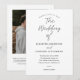 Invitation de mariage avec code QR noir et blanc Script Moderne. Le dos comporte une photo (que vous pouvez supprimer) et des détails supplémentaires avec le code QR de RSVP. Cliquez sur le bouton modifier pour personnaliser ce design selon vos besoins.