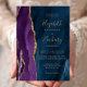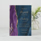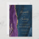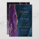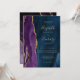 Cette élégante faire-part de mariage moderne présente une aquarelle violette design ornée d'une parties scintillant en faux or. Le texte personnalisable combine écriture manuscrite couleur or, cuivre et polices italiques sur un arrière - plan d'aquarelle bleu marine. L'envers présente un design coordonné d'agate violet et or.