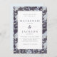 Une jolie et élégante invitation de mariage avec un motif à aquarelle fleurie arrière - plan d'hydrangées bleues et de feuilles sur un arrière - plan bleu ardoise foncé/charbon de bois, surmonté d'un double cadre rectangle. Les détails du mariage sont dans la police serif de fusain bleu ardoise. L'inverse est en bleu clair/poussiéreux. Cette conception fonctionnerait bien pour un mariage d'hiver.