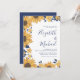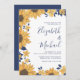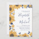 Un faire-part de mariage moderne lumineux et gai avec des aquarelles de tournesols, de fleurs et de feuillage bleu marine, vos prénoms dans un grand script bleu marine et les détails dans la simple typographie bleu marine.