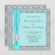 Elégant bleu turquoise avec faire-part de mariage en dentelle argentée. Ajoutez vos détails à l'avant et à l'arrière en ajoutant les détails de l'événement, le style de police, la taille et la couleur de la police et le libellé. Veuillez noter que tous les modèles d'invitation que vous trouverez sur Zazzle sont des graphiques imprimés sur papier plat stock sans bijoux, arcs, surélevés, gaufrés, ou pièces ou pièces ajoutées.