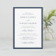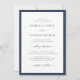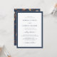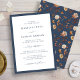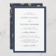 Faire-part de mariage d'automne de la Marine. Cette élégante invitation de mariage a une belle écriture sur le devant et un motif de chute fantaisiste sur le dos avec des feuilles d'orange et de terre cuite peints à la main, dahlias crème et beige, et de beaux roses de couleur rouille sur un arrière - plan de marine. Trouvez les articles correspondants dans la collection Marine Automne Romance.