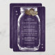 Faire-part de mariage violet rustique avec un bocal de maçon et des coeurs de burlap avec initiales sur un arrière - plan de bois de grange.