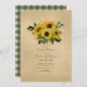 Invitation de mariage champêtre automnal rustique avec tournesols et une nappe à carreaux verts au verso.
