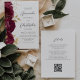 Le bord gauche de cette élégante faire-part de mariage moderne est orné d'une bordure florale bordeaux bordée d'un feuillage en faux feuille d'or. Le texte personnalisable combine le script gris charbon et les polices sans serif sur un arrière - plan blanc. L'envers offre de l'espace pour les détails du mariage, ainsi qu'un code QR que les clients peuvent scanner pour visiter votre site Web et RSVP, ce qui permet d'économiser le coût d'impression et d'envoi de cartes RSVP séparées.