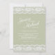 Faire-part de mariage moderne et élégant en dentelle verte et blanche. Les noms sont imprimés dans une belle police de caractères cursive.