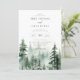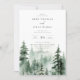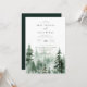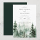 Elégante aquarelle Pine Tree Forest Scène, faire-part de mariage. L'invitation présente un style design typographique chic mélange de calligraphie et de type audacieux. Coordination de l'appui vert foncé de la forêt émeraude.