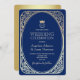 Élégant et formel, ce faire-part de mariage bleu marine et or est doté d'un monogramme royal avec couronne d'or, entouré de frontières botaniques complexes de style feuille. Parfait pour une célébration mariage traditionnelle et luxueuse, il met en valeur les initiales du couple et les détails de l'événement avec typographie classique. Idéal pour les affaires de cravates noires ou les mariages de soirée haut de gamme. Customisez avec vos propres nom, date et emplacement pour une touche intemporelle et royale.