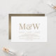 Monogramme d'or blanc ivoire moderne Faire-part de mariage. La typographie moderne avec les initiales du couple en élégant texte de couleur or antique sur le blanc. L'arrière comprend des initiales en blanc en monogramme mariée et mariée sur une oeuvre d'art numérique en or antique martelée. Personnalisez avec le nom de la mariée et du marié, la date du mariage, le lieu du mariage et ajustez l'échantillon de texte et/ou les couleurs de l'invitation selon votre souhait. Visitez notre magasin Zazzle, Austen & Grace, pour voir la suite mariage complète, les produits correspondants et plus encore, et contactez-nous si vous avez besoin d'aide contact@austenandgrace.com
