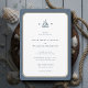 Des idées de mariage simples : une faire-part de mariage classique moderne et élégante, avec un thème nautique, avec un cadre simple arrondi rectangle avec un effet de corde nautique sur un arrière - plan bleu rouillé (effet numérique), ainsi qu'une simple illustration d'un voilier. Il présente également les monogrammes du couple. Vous pouvez personnaliser complètement ce do-it-yourself faire-part de mariage. Un bon choix pour un mariage de bateau, un mariage de yacht, un mariage d'océan, un mariage de bord de mer, un mariage au bord de l'eau ou un mariage à la plage, pour un couple qui aime l'océan, la mer, la plage, la voile, etc.
