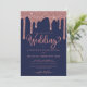 Rose bleu marine Parties scintillant étincelante de mariage Invitations avec fausse parties scintillant dans les tons d'or rose, mauve, et rose rougissant sur un élégant arrière - plan bleu marine. Vos détails, jumelés à notre typographie de script moderne et chic, en font l'invitation parfaite pour votre élégante liaison ou mariage de destination. Veuillez nous contacter à cedarandstring@gmail.com si vous avez besoin d'aide pour la conception ou les produits correspondants.