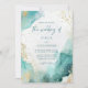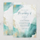 Cette invitation de mariage de plage moderne abstraite présente des éclaboussures d'encre alcoolisée sarcelle et or, et des polices modernes tendance avec une calligraphie script stylée.
