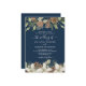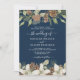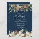 Des cônes de pin d'hiver et des fleurs blanches bordent les bords d'un bleu marine avec d'élégants faire-part de mariage en écriture.