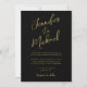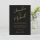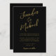 Ces invitations de mariage personnalisées modernes comportent un script de calligraphie en faux or écrit à la main sur un arrière - plan noir. Personnalisez avec vos noms et votre date de mariage avec tous vos détails de mariage. Meilleurs voeux pour votre mariage et mariage ! Conçu par Susan Coffey.