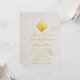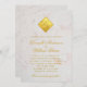 Au-dessus du texte, il y a un monogramme à l'intérieur d'un faux carré de feuille d'or. Le monogramme est formé par les 2 initiales écrites dans un élégant script calligraphique (les par défaut sont D et W). L'arrière - plan (et l'arrière) est en marbre blanc. Tout le texte est doré. Les noms et la dernière phrase "Dîner et danse à suivre", écrit dans un élégant script calligraphique.