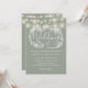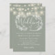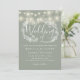 Un faire-part de mariage vert sauge avec de jolies lampes à cordes et une délicate guirlande florale rustique dessinée à la main de feuillage de feuilles botaniques avec typographie stylisée. Personnalisez avec vos informations spéciales pour le jour de mariage. Conçu par Thisisnotme©