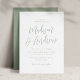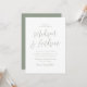 Invitations minimalistes de mariage avec vos noms affichés dans un simple script vert sauge avec vos détails mariages ci-dessous. L'invitation revient à un arrière - plan vert sage solide.