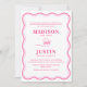 Ce Faire-part de mariage Wavy Pink Retro Squiggle mêle des tons rose et rouge vifs avec des courbes ludiques et des griffes pour une ambiance mariage rétro unique. Le design contemporain présente une calligraphie élégante, donnant une touche fraîche et nostalgique aux invitations de mariage traditionnelles. Idéal pour les couples qui recherchent une faire-part de mariage audacieuse et ondulée qui se démarque par sa modernité et son charme rétro.
