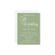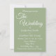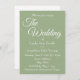Style simple, faire-part de mariage qui comporte un arrière - plan de couleur vert sage tendance avec les futurs noms de mariée et de mariée et la date de l'événement, l'heure, l'emplacement et le registre imprimé en blanc, stylisé. Personnalisez votre faire-part de mariage en remplaçant l'info par la vôtre. Sélectionnez le style et la quantité de papier d'invitation. Conçu pour coordonner avec notre collection Sage Green Simple Style Mariage.