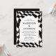Invités Invitations pour fêter votre journée spéciale avec des invitations de mariage Retro Black and White Checkerboard! L'invitation affiche vos noms et vos détails mariages en lettres noires entourées d'un cadre en arc blanc. L'arrière - plan dispose d'un motif abstrait en damier avec un jeu de couleurs noir et blanc.