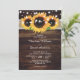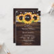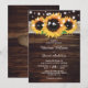 Faire-part de mariage de tournesol rustique avec des tournesols sur un burlap et un coureur de dentelle contre un arrière - plan de bois rustique orné de lampes à cordes. Deux coeurs de burlap à l'arrière. Conception de carte parfaite pour votre mariage rustique, jardin, jardin ou grange inspiré des tournesols.