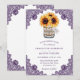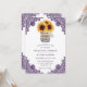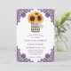 Faire-part de mariage rustique violet et tournesol avec un tournesol et bouquet d'haleine de bébé à l'intérieur d'un bocal de maçon contre un arrière - plan blanc clair orné de dentelle fleurie violette. Un design de carte parfait pour inviter vos invités à votre mariage campagnard violet rustique inspiré des tournesols.