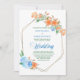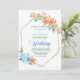 C'est un joli faire-part de mariage fleuri qui crie pratiquement les chaudes journées d'été, parsemées de couleurs vives ! Un cadre hexagone double or brillant est décoré de fleurs orange et bleues accompagnées de feuillage vert. Votre texte personnalisé est en vert foncé au centre. L'arrière de l'invitation est bleu assorti. Belle ! Assurez-vous de voir les produits correspondants dans notre magasin. *Merci à LABFcreations pour les images florales de ce design.