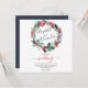 Un faire-part de mariage d'aquarelle florale à fleurs en hiver peint à la main, moderne et élégant, avec des couleurs bleu marine, vert, rouge et une élégante calligraphie de script.
