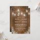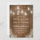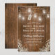 Cartes d'invitation de mariage d'hiver de Noël avec un fond en bois de grange rustique, des lumières de jarre de maçon scintillantes, un décor floral de bébé Respiration dans le coin, une étiquette nouée avec un nœud portant vos initiales et un modèle de mariage simple.