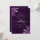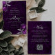 Cette invitation de mariage élégante présente des bouquets de fleurs de prune ornés de feuillage en faux foil argenté dans deux coins, sur une image de fond d'agate aquarelle violette prune. Le verso offre un espace pour les détails du mariage, ainsi qu'un code QR que les invités peuvent scanner pour visiter votre site web et répondre, ce qui permet d'économiser le coût d'impression et d'envoi de cartes de réponse séparées.
